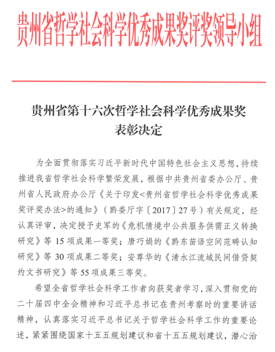 贵州省哲学社会科学优秀成果奖是贵州省哲学社会科学类成果最高奖,每两年评选一次,旨在表彰具有重大理论创新或实践价值的优秀研究成果。学校将以此次获奖为契机,进一步聚焦国家重大战略需求和贵州高质量发展目标,鼓励更多教师学者“把论文写在贵州大地上”,推动科研成果转化应用。