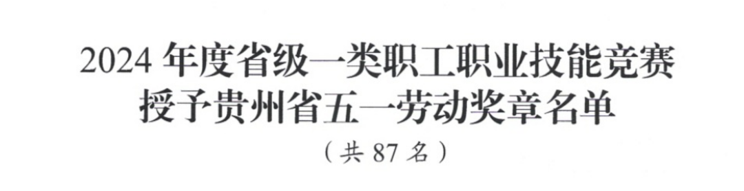 近日,贵州省总工会发布《2024年度省级一类职工职业技能竞赛授予贵州省五一劳动奖章名单》,我校胡伦、吴中鼎、李钟三位教师凭借精湛的专业技能与优异的赛场表现,被授予“贵州省五一劳动奖章”称号。
