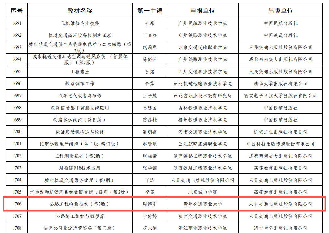 根据教育部发布的《第二批“十四五”职业教育国家规划教材书目》,我校《公路工程检测技术(第7版)》《桥梁工程试验与检测》《汽车维护技术》《人工智能基础与应用(第二版)》4部教材成功入选。