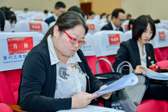 今天的大会气氛热烈,大会主席台正中悬挂着由鲜艳的红旗簇拥着的中国共产党党徽,会场悬挂着“为建设‘行业标杆、全国一流、国际知名’的高水平职业本科大学而努力奋斗”横幅。党徽熠熠生辉,红旗鲜艳似火,会场庄严肃穆。