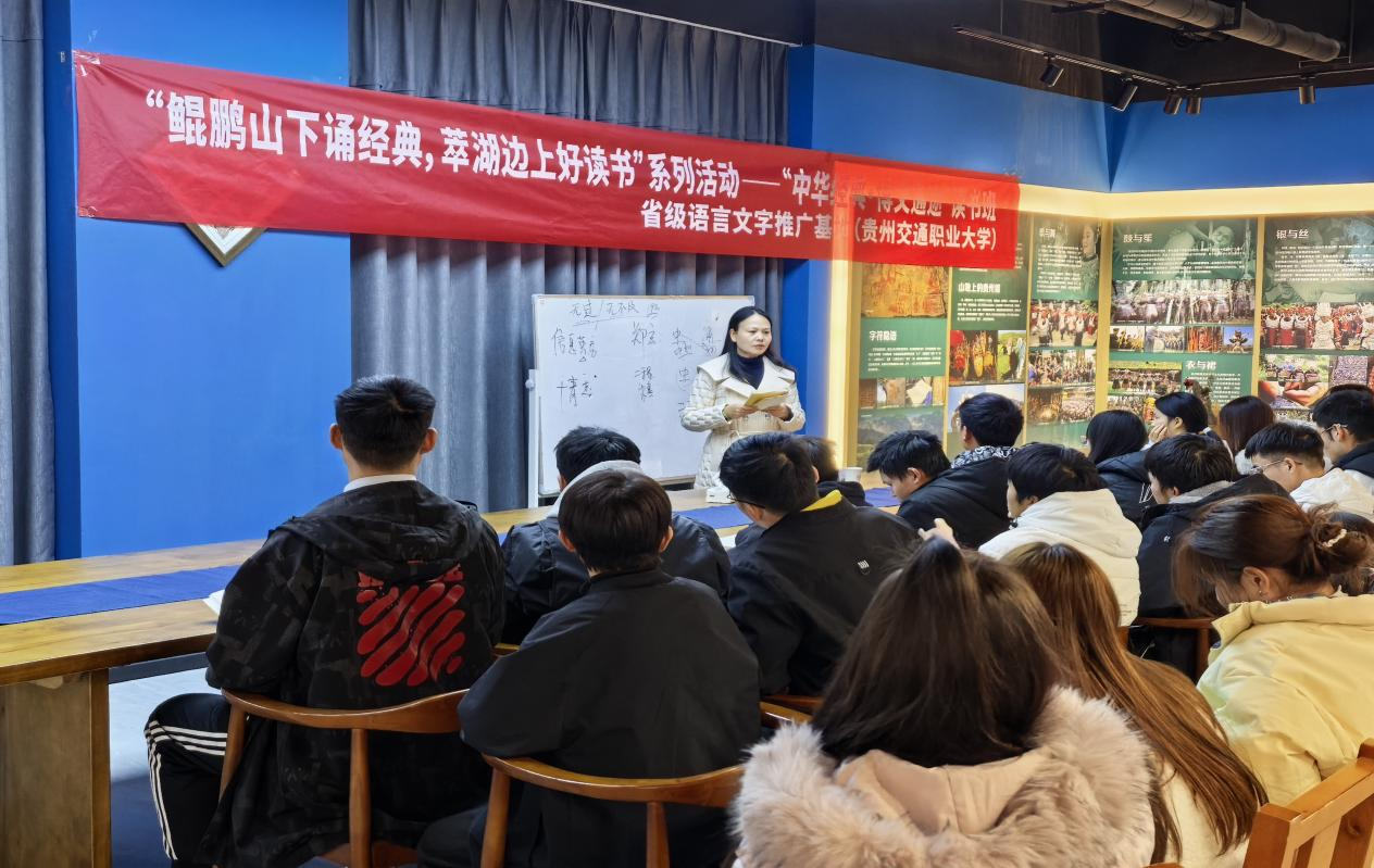 11月12日,由省级语言文字推广基地(贵州交通职业大学)主办,通识教育学院和图书馆联合承办的“中华经典·博文通途”读书班第二期活动在文化千岛艺术馆内开讲。本期读书班仍由贵州交通职业大学副校长、教授、博士贺梦依主讲,带领师生一起走进《大学》第四至第八章,探寻一条“诚意正心”“德润其身”的现代君子养成之路。“中华经典·博文通途”读书班第二期开场贺梦依领读《大学》学生静读《大学》贺梦依在开场时讲道:“今天,我们一起在‘...