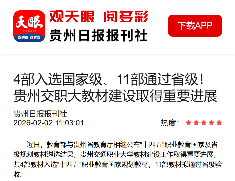 近日,教育部与贵州省教育厅相继公布“十四五”职业教育国家及省级规划教材遴选结果,贵州交通职业大学教材建设工作取得重要进展,共4部教材入选“十四五”职业教育国家规划教材,11部教材拟通过省级验收。根据教育部发布的《第二批“十四五”职业教育国家规划教材书目》,贵州交通职业大学《公路工程检测技术(第7版)》《桥梁工程试验与检测》《汽车维护技术》《人工智能基础与应用(第二版)》4部教材成功入选。贵州省教育厅公布的《...