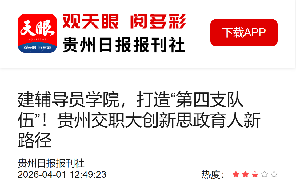 2026年4月1日《贵州教育报》01版春季学期开学以来,贵州交通职业大学辅导员姚杨比往常更忙了。除了备课、进宿舍、跑班级,她还要抽空张罗一件事——“喝茶”。姚老师的“喝茶”可不是个人的小爱好,而是学校近万名师生共同参与的常态化思政交流平台“辅导员下午茶”。辅导员下午茶解锁轻松治愈的午后时光“第四支队伍”的重要意义不言而喻。而让“辅导员下午茶”香飘贵州交职大校园,正是源于多数高校辅导员工作面临的共同困境:职责泛化、...