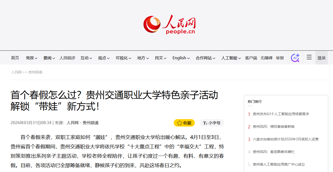 春假限定,快乐上线!4月1日,随着贵州省首个春假正式开启,贵州交通职业大学精心打造的“幸福课堂”暖心开课。近200组校内外亲子家庭走进校园,在趣味体验、红色研学、安全实践与手工创作中尽情撒欢,孩子们玩得尽兴、学得开心,收获了一段充实又难忘的假期时光。活动现场。据了解,依托“马院+书院”协同育人暨大中小学思政课一体化建设实践课堂,学校组织教职工子女走进“大思政”实践教学基地,在交通红色场馆讲解、民族文化体验、...
