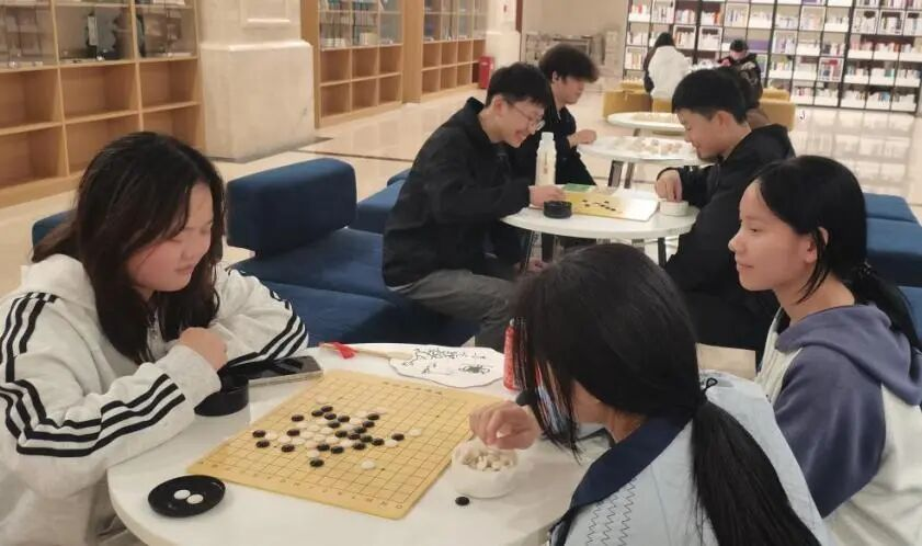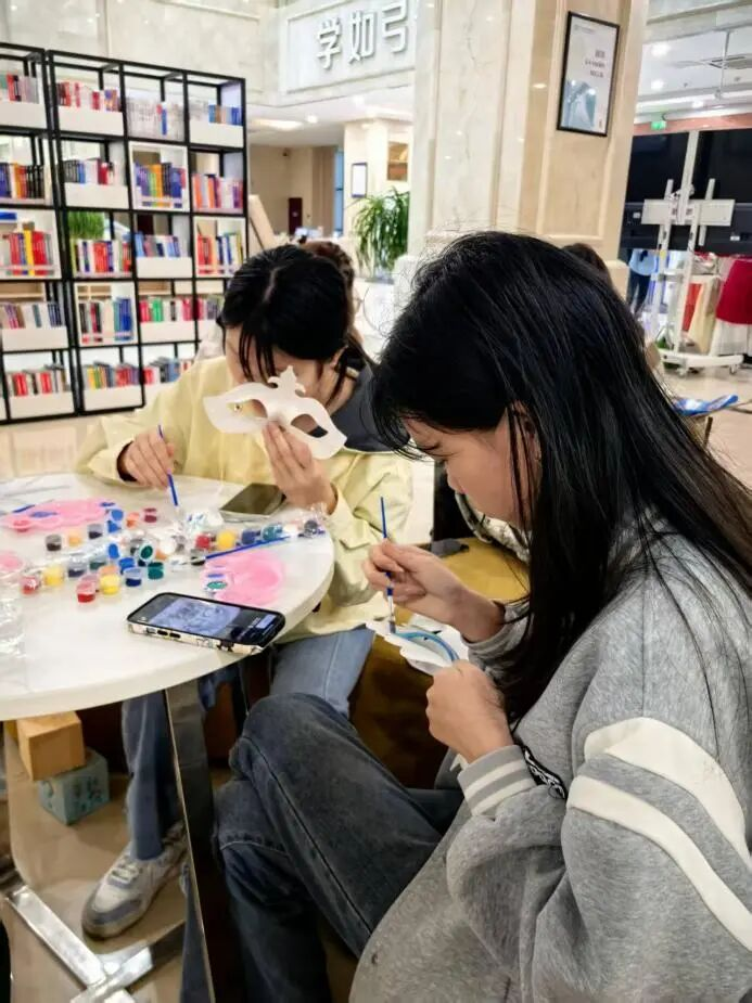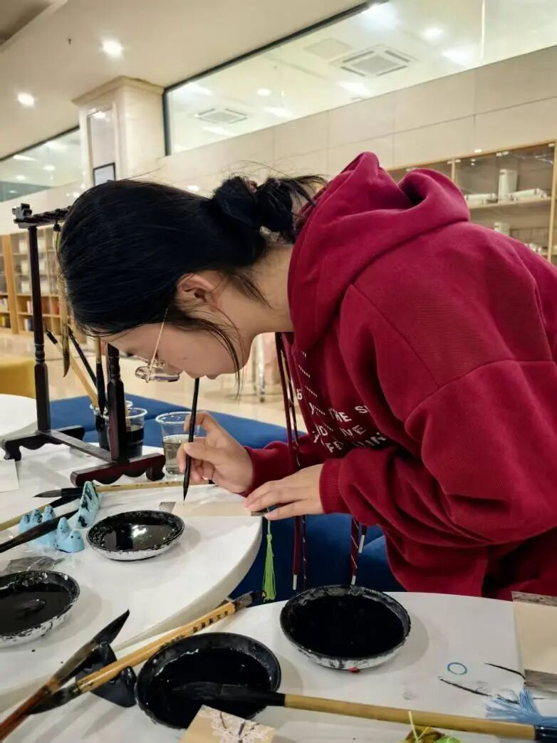 棋趣对弈角内,象棋、围棋、五子棋轮番开战,“闲敲棋子落灯花”之趣油然而生。簪花与面具涂鸦区,同学们领取发箍与花朵自行搭配创作,或以笔墨彩绘面具,一簪一画间尽显巧思。书法展示区墨香氤氲,现场提供书签卡、扇子及笔墨,可提笔自书,一撇一捺皆有风骨。春茗茶席,一盏清茶缕缕飘香,更添几分闲适。