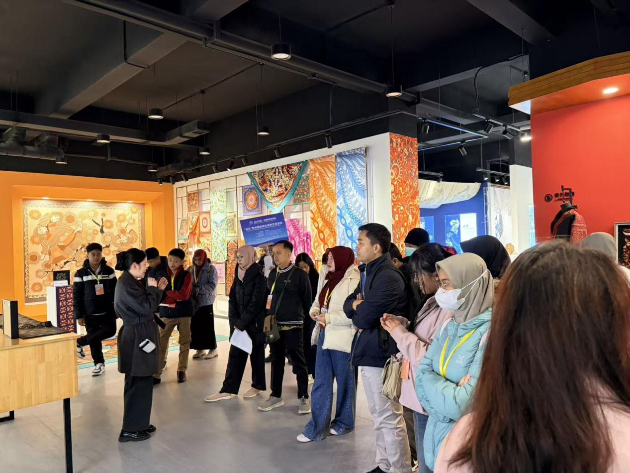 随后,代表团参观了我校千岛文化馆。馆内以贵州多民族文化为核心主题,通过贵州银饰、木雕工艺、蜡染、刺绣、文化丝巾、传统纺织等非遗展品与千岛文旅主题研学内容,全面呈现贵州少数民族传统工艺的技艺精髓与文化底蕴。讲解员向来访师生介绍了贵州民族服饰的文化象征意义,使代表团在沉浸式体验中更加直观地感受到贵州文化的多样性与独特魅力。