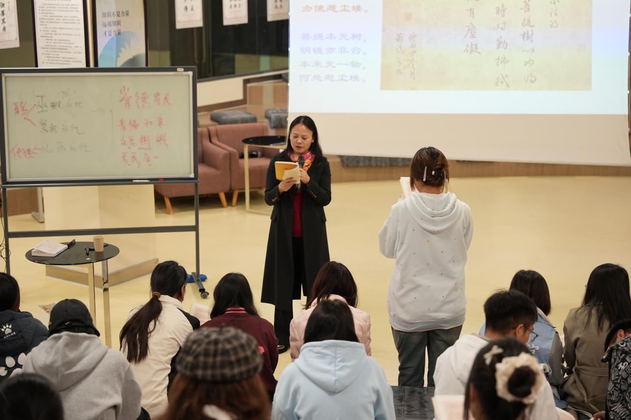 随后,贺梦依带领同学们一起走进《大学》原典,学习并诵读了第一至三章。她循循善诱,让大家全都沉浸在经典文本的字里行间。同学们体会了明明德、亲民、止于至善、格物、致知、诚意、正心、修身、齐家、治国、平天下的中华民族的精神基因与人生内核,为个体成长与社会担当奠定了坚实的基础。活动现场氛围浓厚,书声不断。