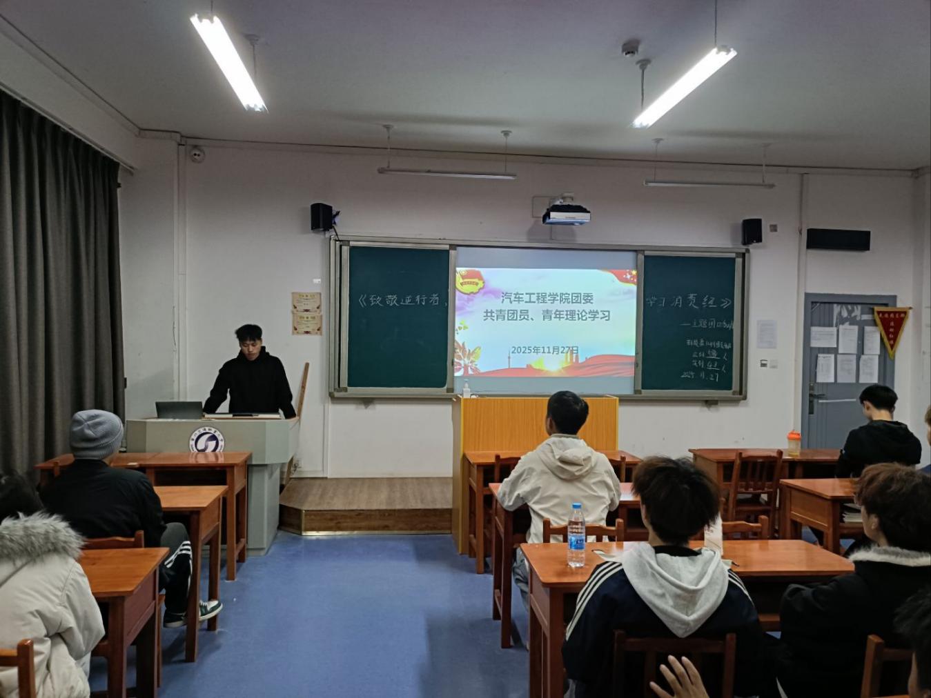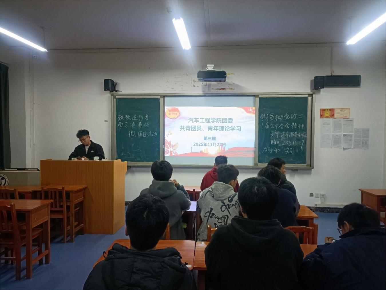 为深入学习贯彻中国共产党第二十届中央委员会第四次全体会议精神,引导广大团员青年深刻把握国家发展大局与时代使命,汽车工程学院团委近期组织开展了专题活动,通过组织专题学习、团员青年理论学习、主题团日活动等多种形式,确保学习覆盖到各团支部和全体团员青年。