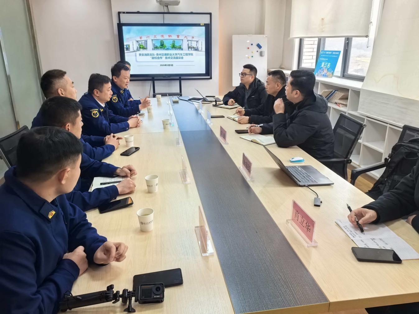 3月3日,贵安新区消防支队后勤保障负责人李怒含一行到我校汽车工程学院开展“政校合作”技术交流座谈会。双方围绕汽车维修技术培训、消防装备改装、消防救援装备研究及课题联合申报等内容进行了深入探讨。汽车工程学院党委书记曹云刚、副院长向巍及相关专业教师参加座谈。